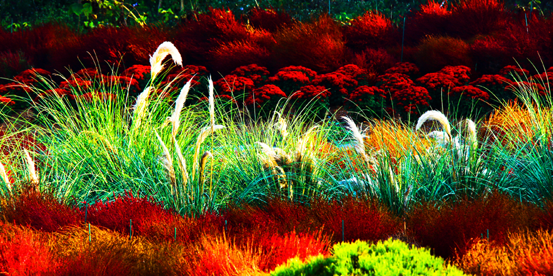 해가 지면 꽃밭은 환상적인 LED 조명으로 변신해요.